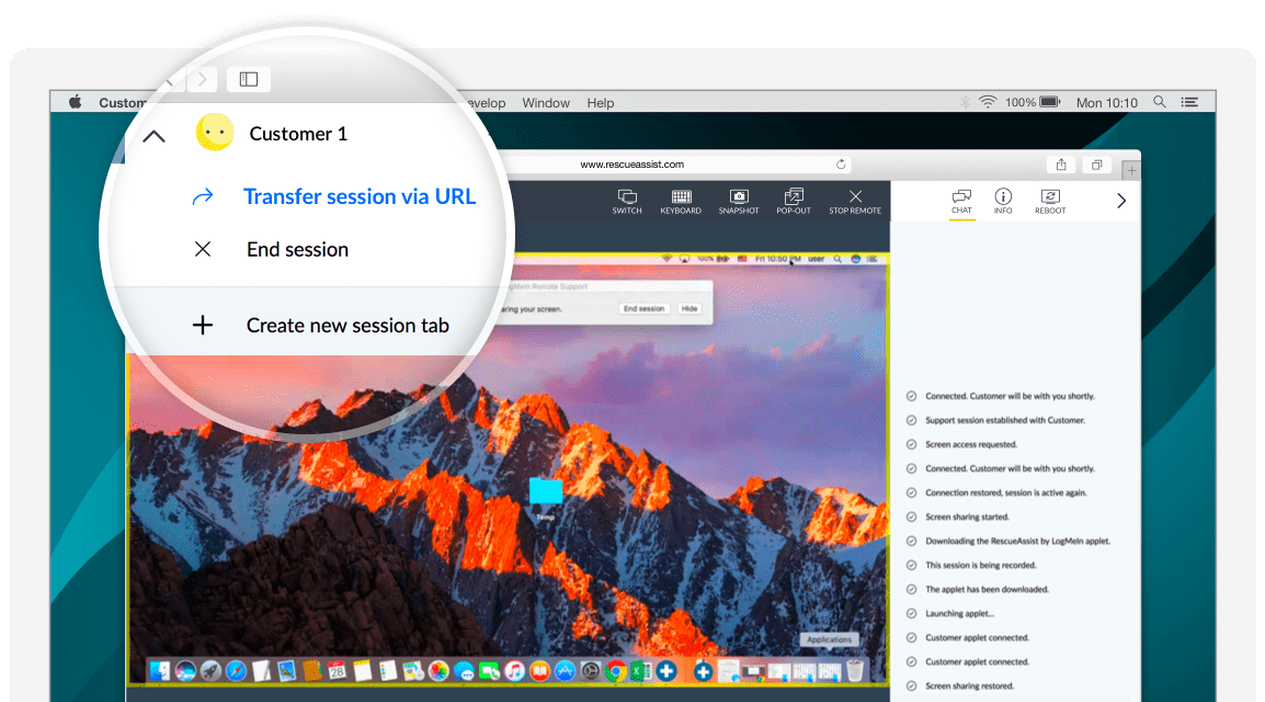 Giving someone else your support session is a quick process. From the drop-down menu on the session thumbnail, you can select to invite another technician by email. Or, you can copy the session URL to paste in chat. Once the technician clicks the link, he or she will immediately join the session. You’re then free to leave the session, and it will carry on like normal.