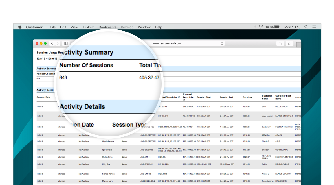 Con RescueAssist puede conocer hasta el último detalle de sus actividades de asistencia técnica, desde la duración media hasta el tipo de sesión o el nombre del cliente. Puede ver en todo momento si su equipo está a la altura de los acuerdos de nivel de servicio. Para acceder a una lista con todos los parámetros incluidos en los informes de las sesiones de RescueAssist, visite nuestra página de asistencia sobre generación de informes de sesiones.