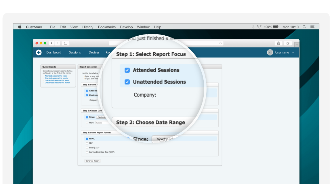 En RescueAssist puede generar dos tipos de informes. Los informes rápidos están preconfigurados para que pueda obtener las cifras de la última semana o el último mes de actividad en un solo clic. Y con los informes personalizados puede llegar hasta el fondo y filtrar, por ejemplo, por tipo de sesión, empresa, técnico o intervalo de fechas, para obtener justo lo que está buscando.