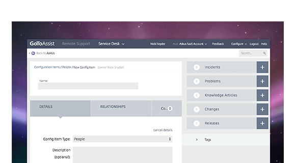 Les éléments de configuration peuvent désigner n'importe quel(le) entreprise, individu, lieu, logiciel ou appareil associé avec vos services. Lorsque vous avez ajouté assez d'informations dans votre base de donnée de gestion de la configuration (CMDB) dans Service Desk, vous pouvez bâtir un réseau avec leurs relations les unes aux autres. Ceci vous aide à comprendre votre environnement informatique et les problèmes qui peuvent affecter les actifs.